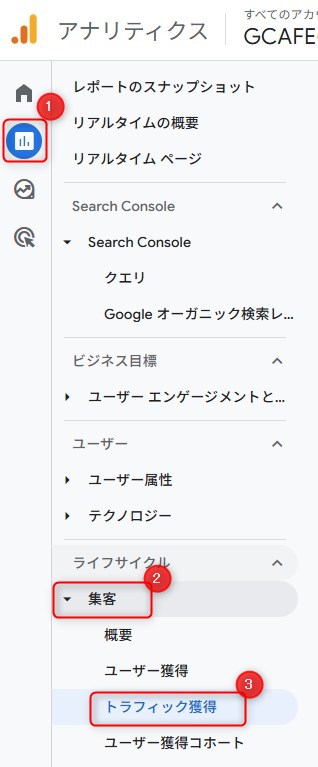 - 見る場所: レポート > 集客 > トラフィック獲得