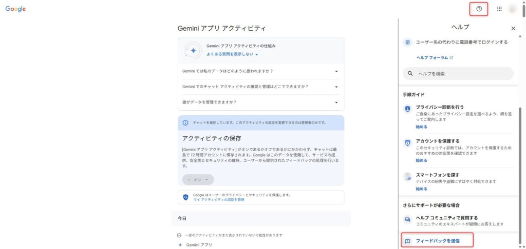 Geminiの「サポート」=「フィードバック送信」です