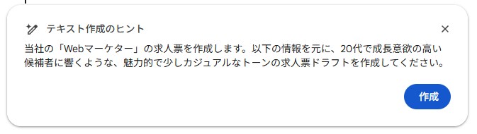 プロンプト例: 当社の「Webマーケター」の求人票を作成します。以下の情報を元に、20代で成長意欲の高い候補者に響くような、魅力的で少しカジュアルなトーンの求人票ドラフトを作成してください。