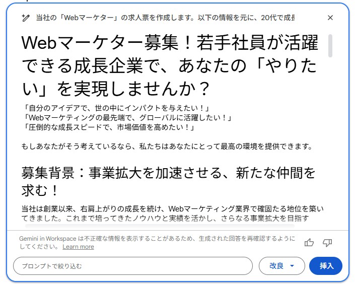 Geminiはこれらの情報をもとに、仕事の魅力ややりがい、企業のカルチャーまで伝わるような、生き生きとした求人票のドラフトを数分で作成します。さらに、「もっと企業の成長性をアピールして」といった追加指示で、何度でもブラッシュアップが可能です。