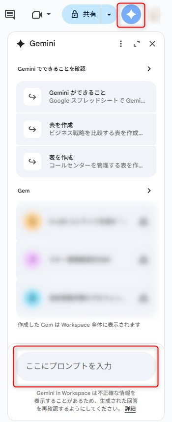 ステップ: Google Sheetsを開き、「スマートチップとスマートテキスト」やGeminiサイドパネルで、以下のように依頼します。